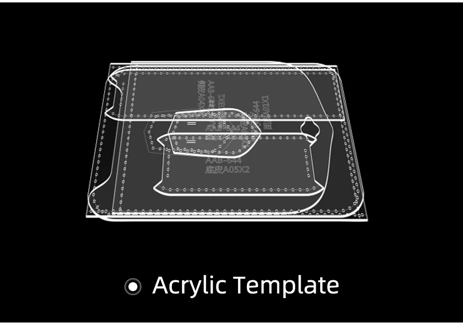 ----Acrylic: Acrylic is heavier than kraft paper, and it is not easy to slip when drawing lines. The transparent material can see the leather material to avoid cutting errors. It can be reused. The stitching holes of the acrylic pattern are circular stitching holes with a pitch of 4.00mm.